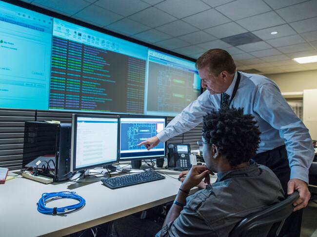 Colegas trabajando en un cuarto de control observando la pantalla de la computadora (Getty Images) / Erik Isakson