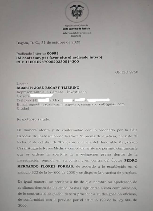 La Corte Suprema de Justicia abrió investigación previa este 31 de octubre en contra del representante del Pacto Histórico, Agmeth Escaf, luego de las declaraciones que entregó Nicolás Petro, hijo del presidente de la República, en el extenso interrogatorio que presentó en el búnker de la Fiscalía.