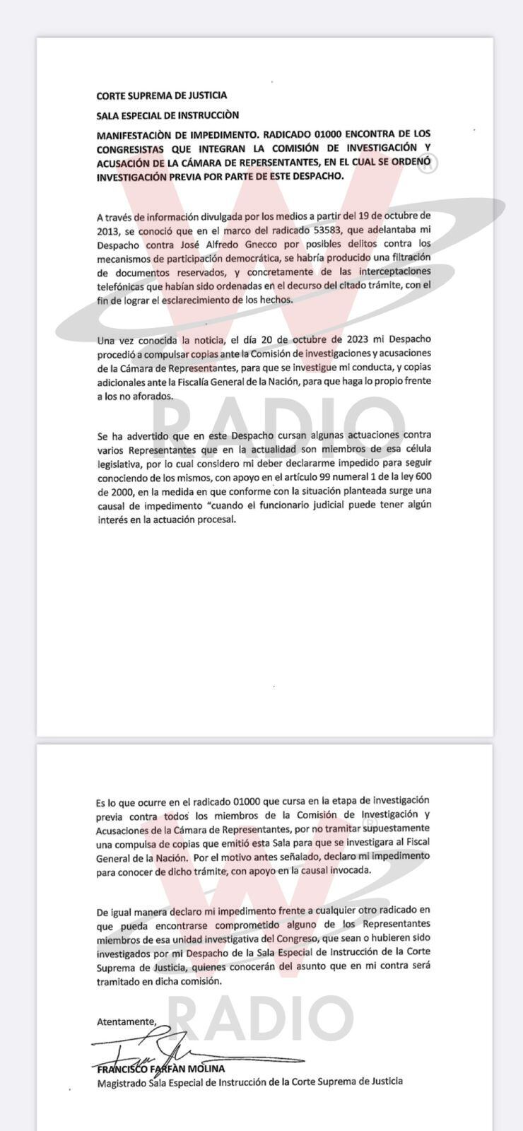 Por lo que el magistrado presentó su impedimento este 1 de noviembre: “de igual manera, declaro mi impedimento frente a cualquier otro radicado en que pueda encontrarse comprometido alguno de los representantes miembros de esa unidad investigativa del Congreso, que sean o hubieren sido investigados por mi Despacho de la Sala Especial de Instrucción de la Corte Suprema de Justicia, quienes conocerán del asunto que en mi contra será tramitado en dicha comisión”.
