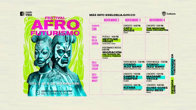 Música en vivo, conciertos, talleres, conversatorios, cine y experiencias interactivas llegan al Centro Nacional de las Artes Delia Zapata Olivella en Bogotá para transportar a los capitalinos a la zona del Pacífico colombiano y del África. Del 2 al 4 de noviembre podrán disfrutar del Festival Afrofuturismo, en el que se mezclan sonidos africanos con ciencia ficción, fantasía, tecnología y, sobre todo, mucha innovación.