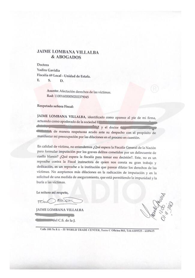 En el documento conocido por La W, el reconocido penalista le expresó a la fiscal 69 local de la Unidad de Estafa, Yadira Gaviria, su preocupación por lo que consideró “dilaciones” en el proceso contra Rocha Medina.