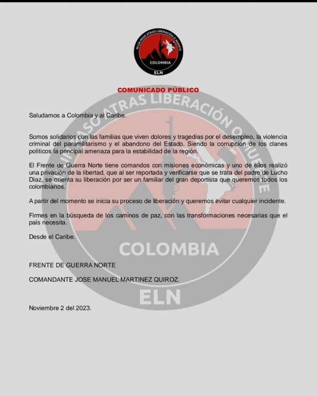 “El Frente de Guerra Norte tiene comandos con misiones económicas y uno de ellos realizó la privación de la libertad que al ser reportada y verificarse que se trata del padre de Lucho Díaz, se orienta su liberación por ser un familiar del gran deportista que queremos todos los colombianos” indicaron los guerrilleros.