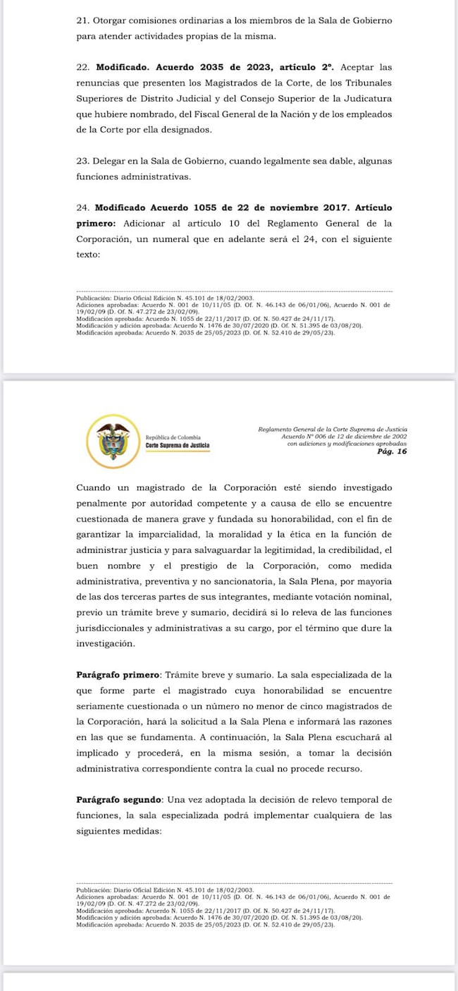 “Cuando un magistrado de la Corporación esté siendo investigado penalmente por autoridad competente y a causa de ello se encuentre cuestionada de manera grave y fundada su honorabilidad, con el fin de garantizar la imparcialidad, la moralidad y la ética en la función de administrar justicia y para salvaguardar la legitimidad, la credibilidad, el buen nombre y el prestigio de la Corporación”, inicia el artículo.
