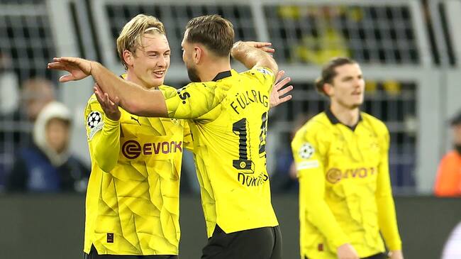 Julian Brandt (izquierda) de Borussia Dortmund celebra su gol en Champions frente a Newcastle. 7 de noviembre de 2023. Foto: EFE/EPA/CHRISTOPHER NEUNDORF / CHRISTOPHER NEUNDORF (EFE)