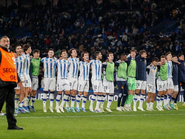 Los jugadores de la Real Sociedad celebran la victoria al término del partido de la fase de grupos de la Liga de Campeones entre la Real Sociedad y el Benfica, disputado este miércoles en el Reale Arena de San Sebastián. Foto: EFE/Juan Herrero / Juan Herrero (EFE)