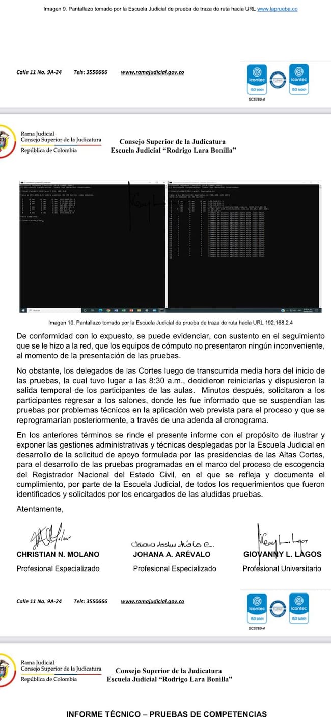Así lo sostuvo la Escuela Judicial Rodrigo Lara Bonilla al sustentar con pruebas que los equipos de cómputo no presentaron ningún inconveniente en el momento de la realización de las pruebas para elegir al reemplazo de Alexander Vega.