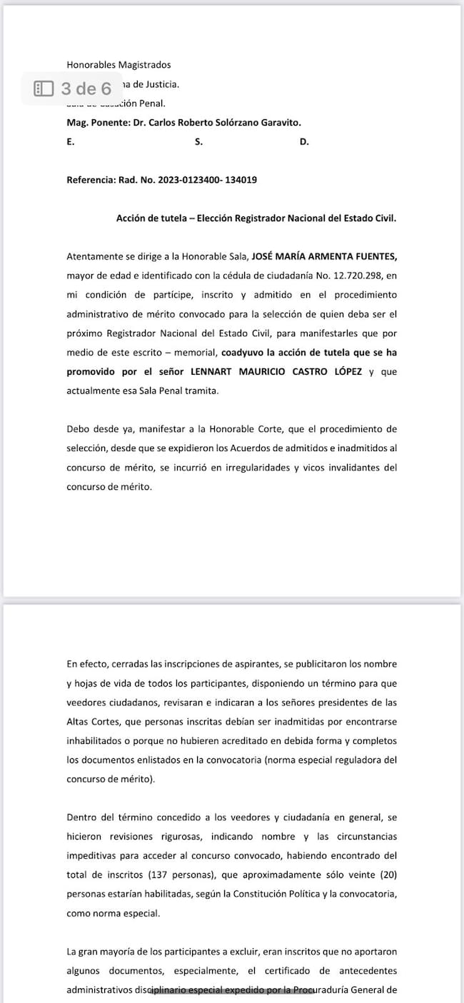 En la tutela, el Dr. Castro López, alega que hubo varias irregularidades y además recuerda que las mismas cortes aceptaron ciertos errores en la prueba de conocimientos y que, por ende, tuvieron que agregar tres aspirantes más a la lista de 10 que surgió luego de los exámenes de méritos que presentaron 37 candidatos. La última lista de aspirantes contiene 13 aspirantes.