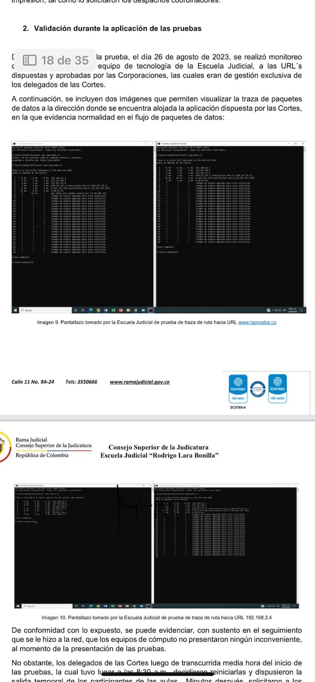 Ahora, lo que sostiene la Escuela Judicial es que, durante la aplicación de la prueba, el día 26 de agosto de 2023, se realizó monitoreo constante por parte del equipo de tecnología de la Escuela Judicial, a las URLs dispuestas y aprobadas por las Corporaciones, las cuales eran de gestión exclusiva de los delegados de las Cortes, y que se desarrollaron con normalidad.