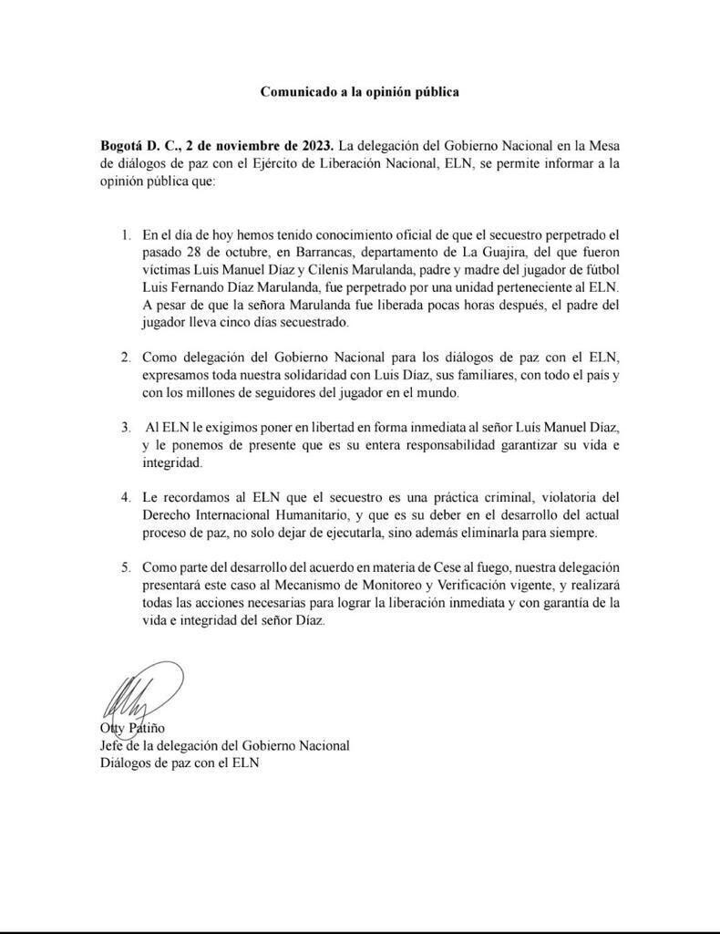 A través de un comunicado, firmado el 2 de noviembre, las delegaciones de paz del Gobierno y del Ejército de Liberación Nacional (ELN) confirmaron que ese grupo guerrillero era responsable del secuestro de Luis Manuel Díaz, papá del jugador.