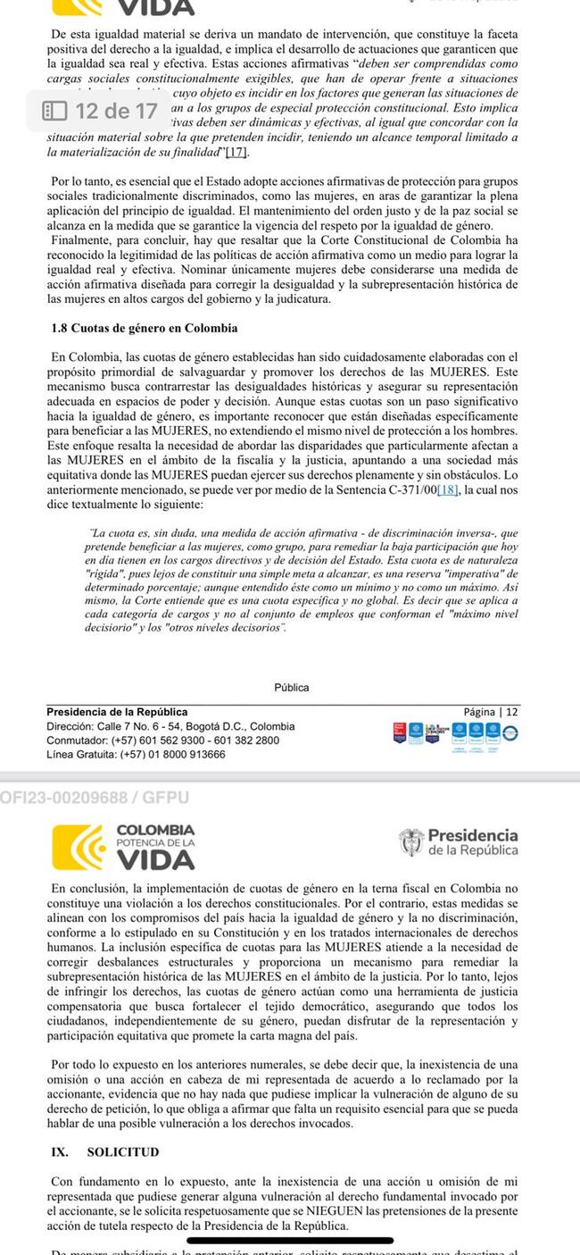 La Presidencia de la República desestimó la tutela del magistrado Gerardo Botero en un concepto enviado al Consejo de Estado, y precisó que la nominación de solo mujeres busca combatir la desigualdad.