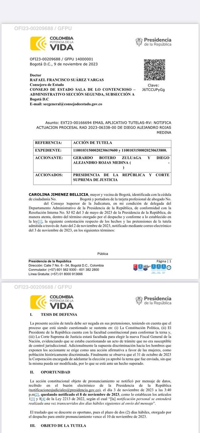 La Presidencia le envió un concepto al Consejo de Estado por la tutela que presentó el magistrado y presidente de la sala laboral, de la Corte Suprema de Justicia Gerardo Botero, contra la conformación de la terna por estar compuesta de solo de mujeres.