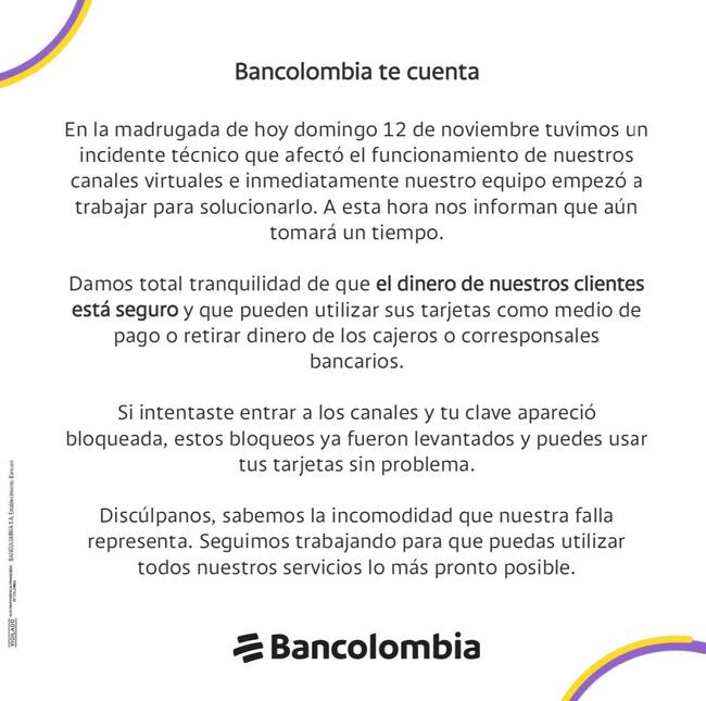 Al respecto, Bancolombia reconoció que “en la madrugada de hoy domingo 12 de noviembre tuvimos un incidente técnico que afectó el funcionamiento de nuestros canales virtuales e inmediatamente nuestro equipo empezó a trabajar para solucionarlo”.