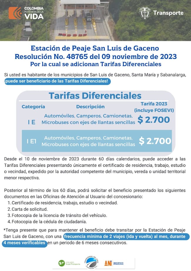 Por su parte desde la Trasversal del Sisga han señalado a través de sus redes sociales que “si usted es residente en los municipios de San Luis de Gaceno, Santa María y Sabanalarga, puede ser beneficiario de las Tarifas Diferenciales del peaje de San Luis de Gaceno”.