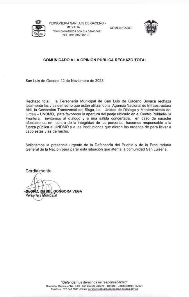 De otro lado, la personera del municipio de San Luis de Gaceno, Gloria Isabel Góngora, rechazó a través de un comunicado el uso de la fuerza por parte de la UNDMO para favorecer la apertura del peaje.
