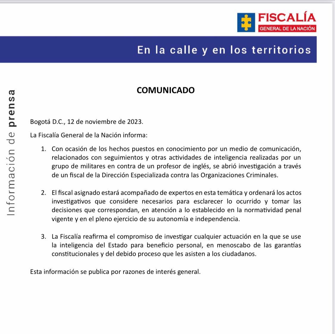 “Con ocasión de los hechos puestos en conocimiento por un medio de comunicación, relacionados con seguimientos y otras actividades de inteligencia realizadas por un grupo de militares en contra de un profesor de inglés, se abrió investigación a través de un fiscal de la Dirección Especializada contra las Organizaciones Criminales”.