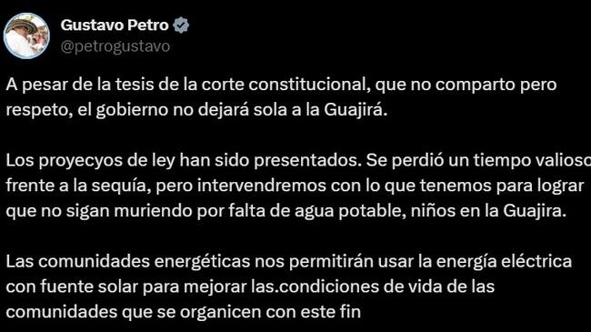 Después de que la Corte Constitucional tumbara otros dos decretos de emergencia en La Guajira, el presidente Gustavo Petro mencionó en su cuenta de X que su Gobierno no dejará solo al departamento.