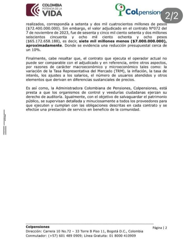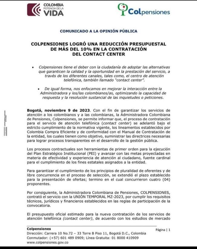 Previo a al análisis a continuación, Sigue La W consultó a Colpensiones, quienes respondieron con un comunicado a la opinión pública que titulan “Colpensiones logró una reducción presupuestal de más del 10% en la contratación del Contact Center”, ya que, desde septiembre se conoció una licitación que llamaba la atención al interior de la entidad.