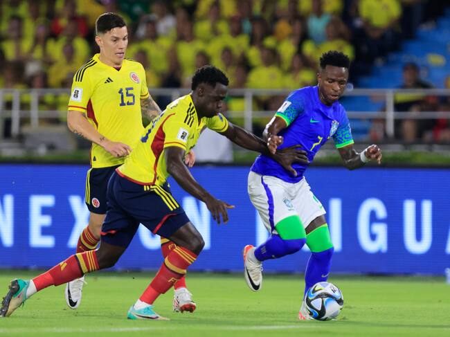 AMDEP3315. BARRANQUILLA (COLOMBIA), 16/11/2023.- Davinson Sánchez (i) de Colombia disputa el balón con Vinícius Júnior de Brasil, el 16 de noviembre de 2023, en un partido de las Eliminatorias Sudamericanas para la Copa Mundial de Fútbol 2026 entre Colombia y Brasil en el estadio Metropolitano en Barranquilla (Colombia). EFE/ Ricardo Maldonado Rozo / Ricardo Maldonado Rozo (EFE)