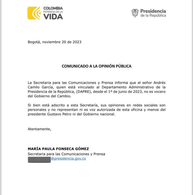 “Si bien está adscrito a esta Secretaría, sus opiniones en redes sociales son personales y no representan ni es voz autorizada de esta oficina y menos del presidente Gustavo Petro ni del Gobierno Nacional”, dice el comunicado.