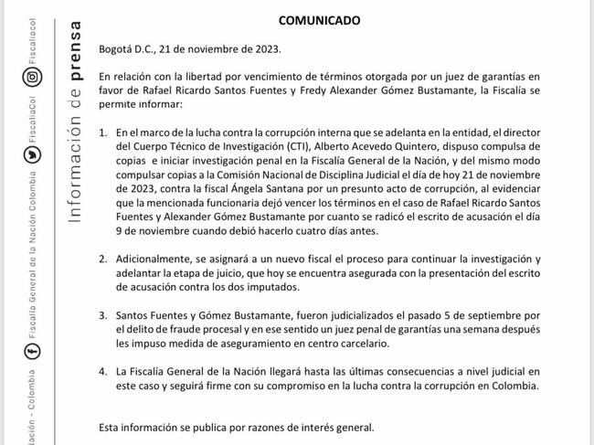 “En el marco de la lucha contra la corrupción interna que se adelanta en la entidad, el director del Cuerpo Técnico de Investigación (CTI), Alberto Acevedo Quintero, dispuso compulsa de copias e iniciar investigación penal en la Fiscalía General de la Nación, y del mismo modo compulsar copias a la Comisión Nacional de Disciplina Judicial el día de hoy 21 de noviembre de 2023, contra la fiscal Ángela Santana por un presunto acto de corrupción, al evidenciar que la mencionada funcionaria dejó vencer los términos en el caso de Rafael Ricardo Santos Fuentes y Alexander Gómez Bustamante por cuanto se radicó el escrito de acusación el día 9 de noviembre cuando debió hacerlo cuatro días antes”, mencionó la Fiscalía en un comunicado.
