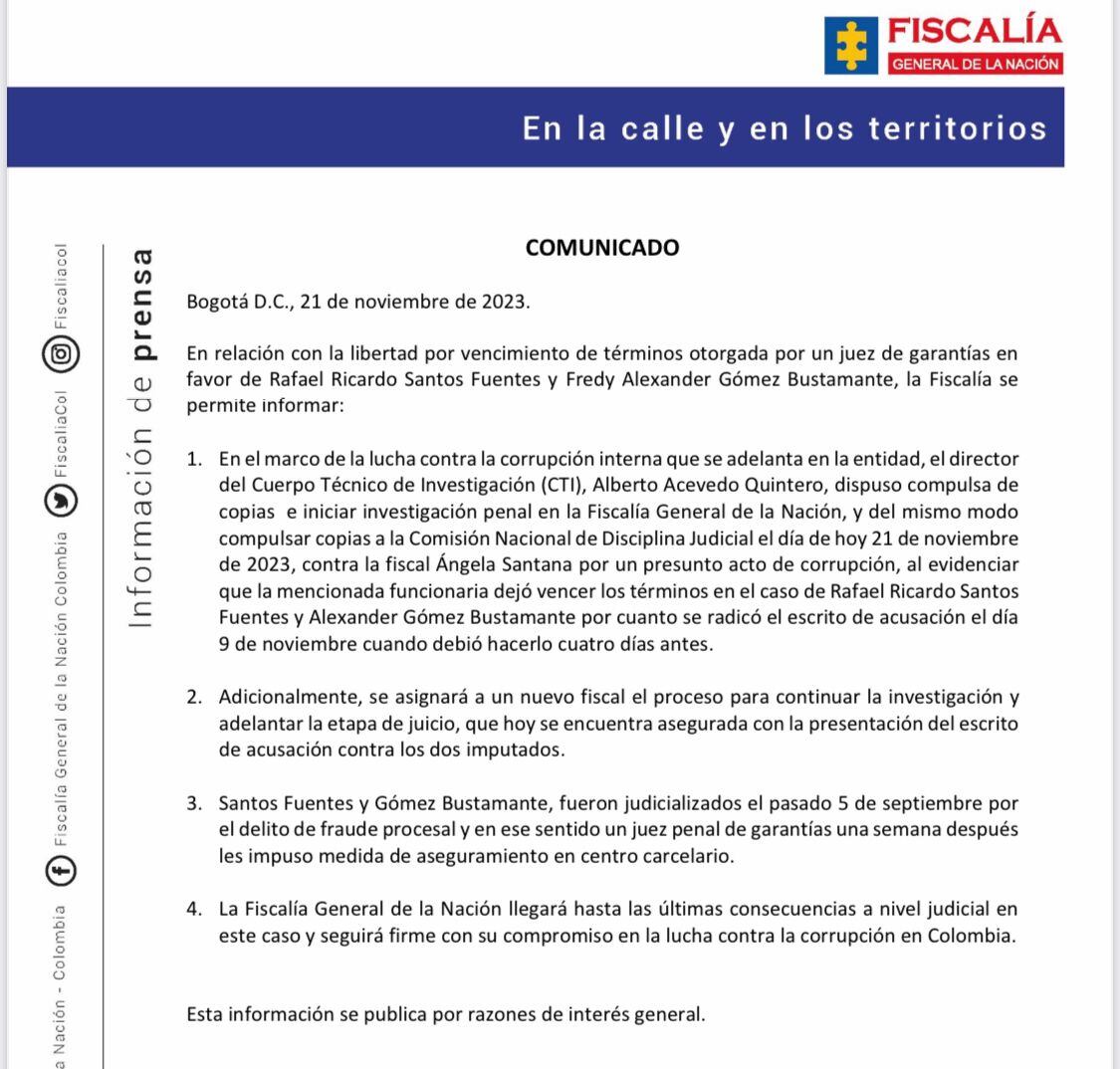 “En el marco de la lucha contra la corrupción interna que se adelanta en la entidad, el director del Cuerpo Técnico de Investigación (CTI), Alberto Acevedo Quintero, dispuso compulsa de copias e iniciar investigación penal en la Fiscalía General de la Nación, y del mismo modo compulsar copias a la Comisión Nacional de Disciplina Judicial el día de hoy 21 de noviembre de 2023, contra la fiscal Ángela Santana por un presunto acto de corrupción, al evidenciar que la mencionada funcionaria dejó vencer los términos en el caso de Rafael Ricardo Santos Fuentes y Alexander Gómez Bustamante por cuanto se radicó el escrito de acusación el día 9 de noviembre cuando debió hacerlo cuatro días antes”, mencionó la Fiscalía en un comunicado.