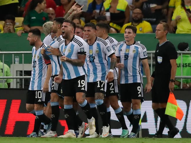 Nicolás Otamendi (c) de Argentina celebra su gol hoy, en un partido de las eliminatorias para la Copa Mundo de Fútbol de 2026 entre Brasil y Argentina en el estadio Maracaná en Río de Janeiro (Brasil). Foto: EFE/ Andre Coelho / Andre Coelho (EFE)