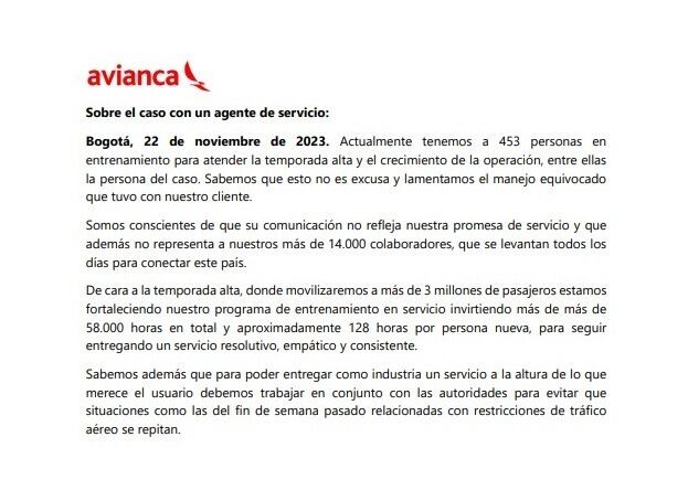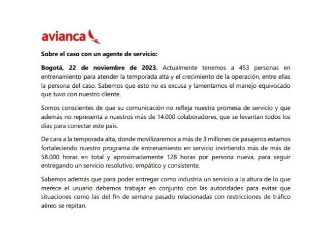Tras la denuncia en la que una agente de la aerolínea Avianca le responde a su cliente: “si usted fuera mi papá o alguien importante, yo podría ayudarlo”, la empresa se pronunció.