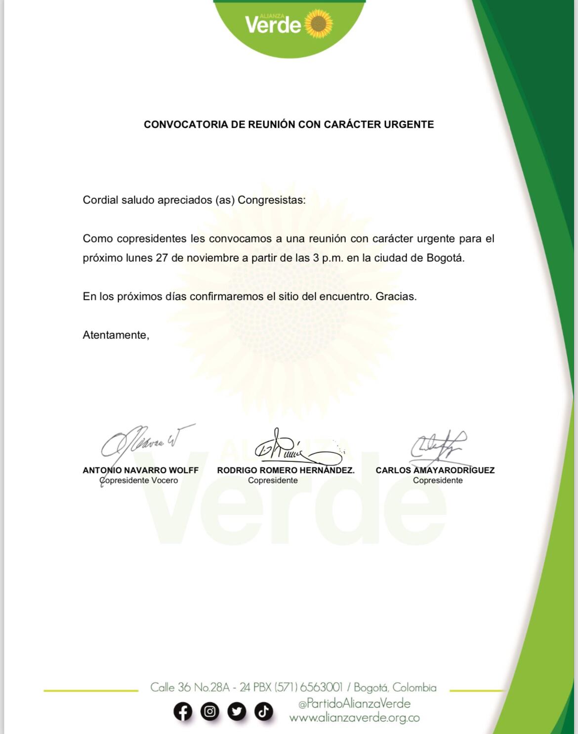 Finalmente, los verdes citaron a reunión urgente para el próximo lunes 27 de noviembre, con el fin de evaluar la situación.