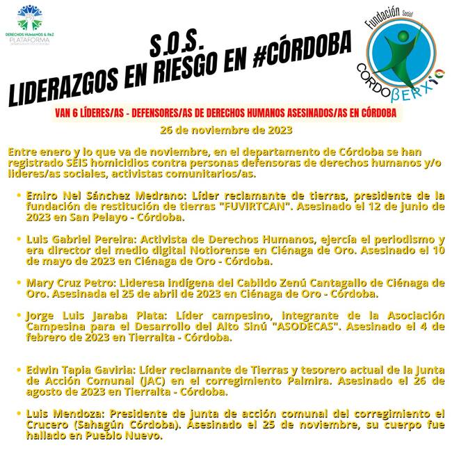 Finalmente, la Fundación Córdoberxia advirtió que, en lo que va corrido del año 2023, seis líderes sociales han sido asesinados en el departamento de Córdoba, donde también cuestionaron el actuar del gobernador Orlando Benítez, por la falta de sesión de la Mesa Territorial de Garantías.