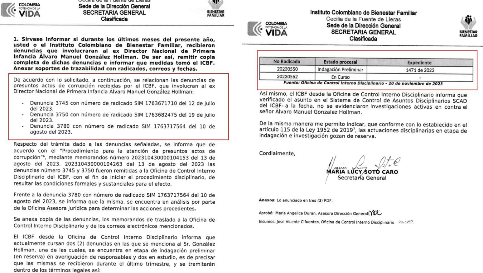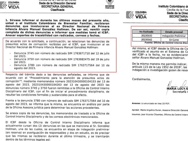 Finalmente, se conoció también el documento de respuesta por parte del ICBF, firmado por la secretaria general Maria Lucy Soto, ante el requerimiento público de conocer las denuncias en las que está involucrado Álvaro González y cómo van los procesos, dando cuenta de tres, de las cuales, una se encuentra en indagación preliminar y otra en curso, siendo la prueba reina de una presunta corrupción que está en investigación.
