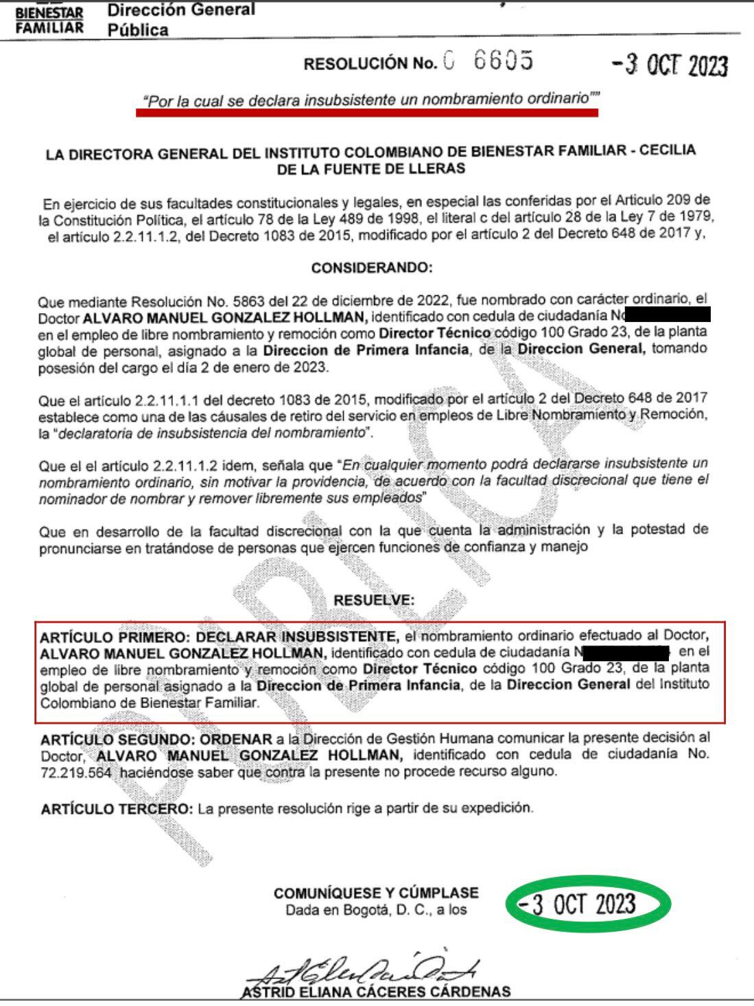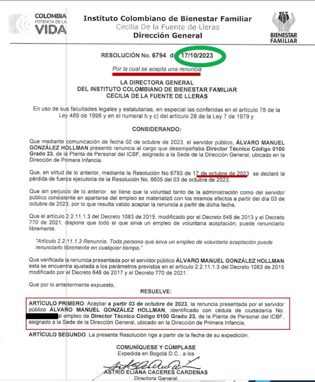 Curiosamente, 15 días después, el 17 de octubre de 2023 la directora general del ICBF, Astrid Cáceres, firmó la resolución 6794, por medio de la que se aceptaba la renuncia de este, como si se fuera de la entidad por voluntad propia y no por sus investigaciones por corrupción, dándole la posibilidad de ocupar el cargo de consejero presidencial.