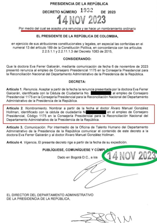 Sin embargo, pese a este historial, González fue nombrado el 14 de noviembre, casi un mes después, en la Consejería Presidencial para la Reconciliación por parte del Gobierno Petro.