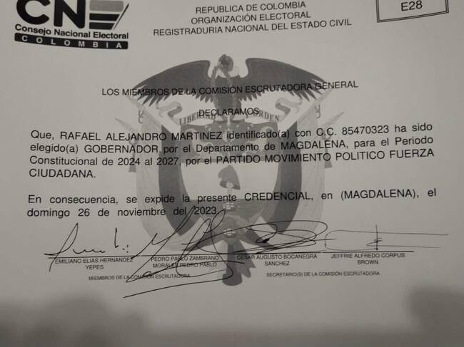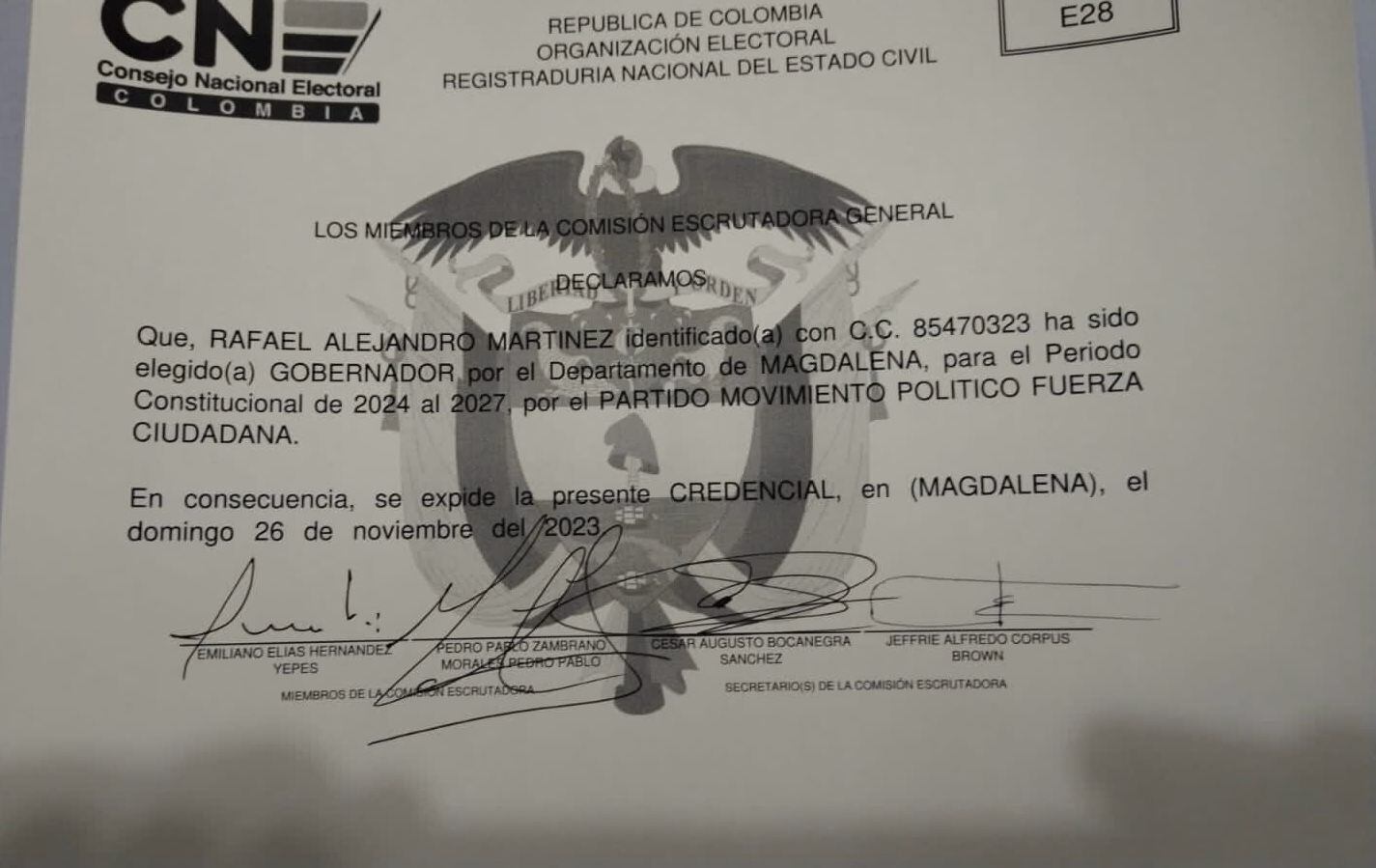 La Comisión Escrutadora entregó la credencial como gobernador del Magdalena a Rafael Martínez. Sobre el documento que lo ratifica como mandatario de los magdalenenses no se ha pronunciado al respecto.
