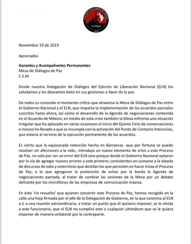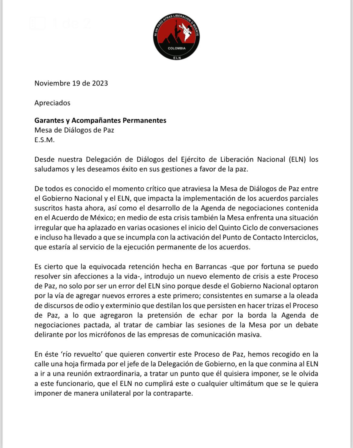 En la primera carta, señalan que el secuestro al padre de jugador ‘Lucho’ Diaz, el señor Luis Manuel Diaz, llevó a una crisis “no solo por ser un error del ELN sino porque desde el Gobierno Nacional optaron por la vía de agregar nuevos errores a este primero; consistentes en sumarse a la oleada de discursos de odio y exterminio que destilan los que persisten en hacer trizas el proceso de paz (….) el ELN no cumplirá este o cualquier ultimátum que se le quiera imponer de manera unilateral por la contraparte”.