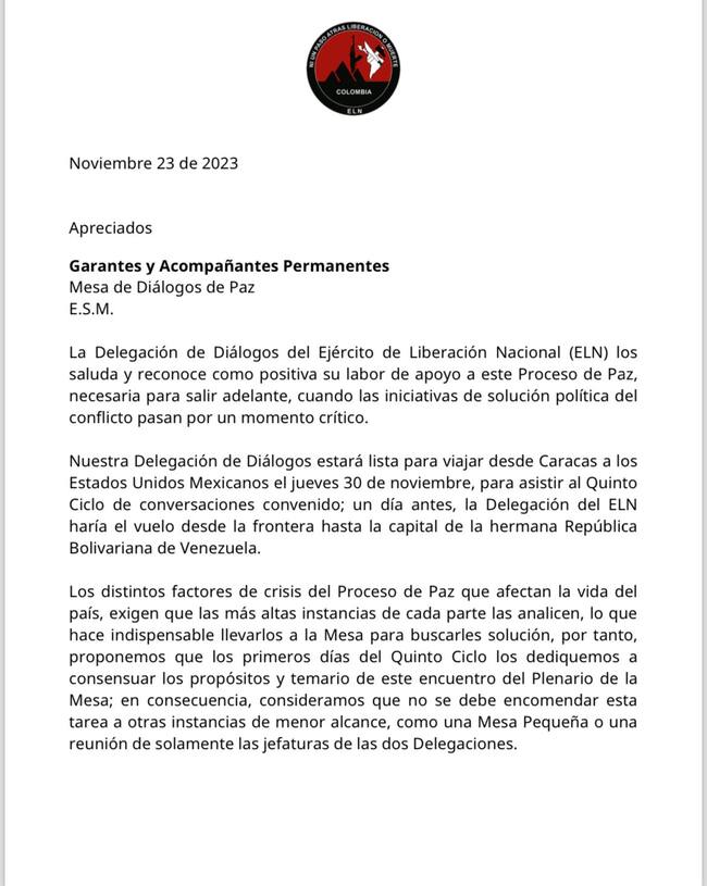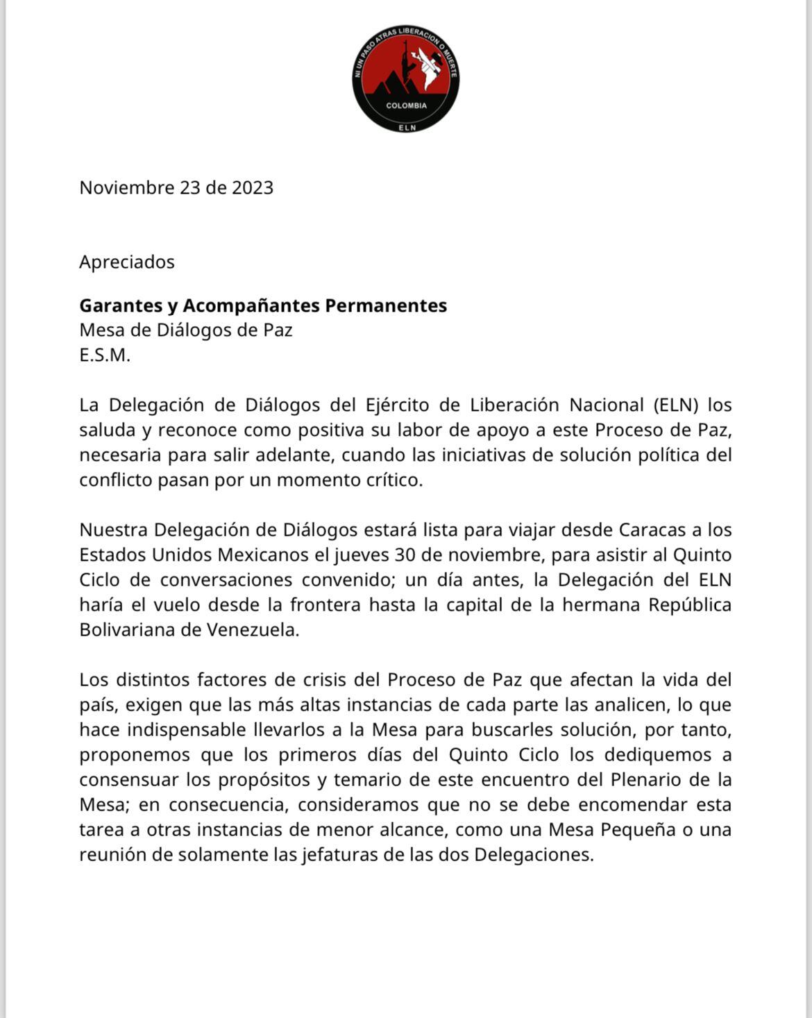 Fuentes le confirmaron a W Radio que las cartas enviadas el 19 y 23 de noviembre a garantes y acompañantes de la mesa de diálogos con el ELN, corresponde a la delegación de este grupo armado. En ellas aseguran que se presenta una crisis y que no aceptarán “imposiciones del Gobierno”.