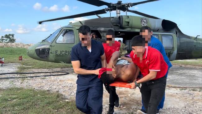 “De igual manera, en medio del movimiento de las tropas, fue localizado un integrante de ese grupo armado organizado, quien se encontraba gravemente herido. De inmediato los enfermeros militares de combate le brindan los primeros auxilios y lo evacuan en un helicóptero hacia Santa Rosa del Sur, Bolívar. A esta hora el sujeto recibe atención médica y se encuentre estable.