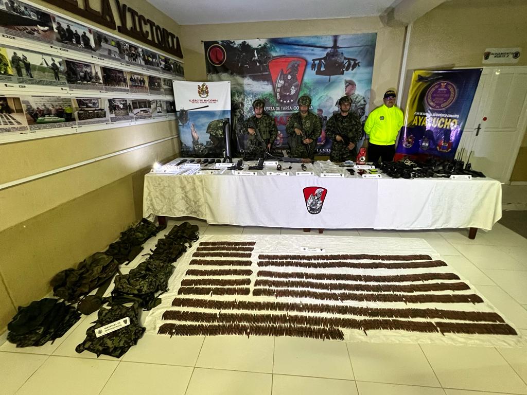 “Producto del esfuerzo operacional, las tropas del Ejército Nacional, la Armada y la Fuerza Aeroespacial, localizaron dos fusiles, cuatro pistolas, un mortero calibre 60mm, una granada de 60mm, más de 5000 unidades de munición de diferentes calibres, 21 radios de comunicaciones, una mira para fusil, proveedores y material de intendencia”, dicen las FF.MM.