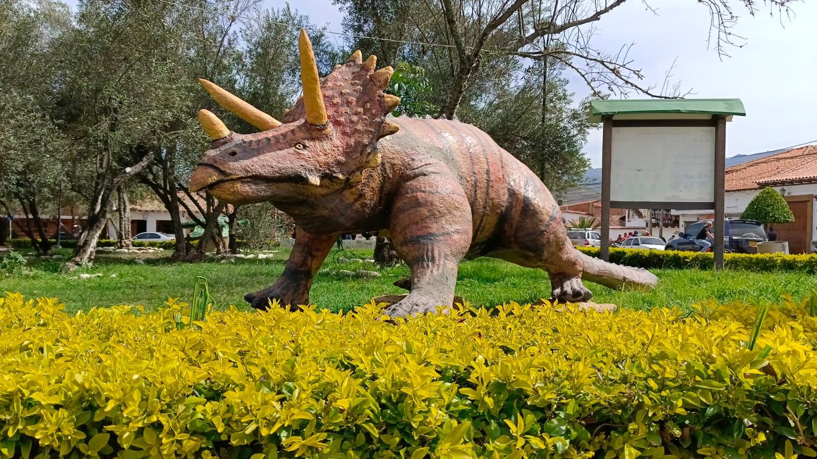 La figura en gran escala del Triceratops, está ubicada en el parque principal del municipio de Sáchica en Boyacá / Foto. Suministrada.