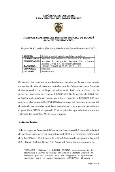 El Tribunal Superior de Bogotá revocó las medidas cautelares ordenadas por la Superintendencia de Industria y Comercio (SIC) en medio del proceso que inició Avianca contra Latam Airlines, por competencia desleal.