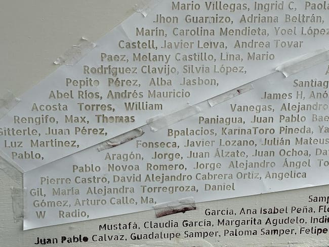 Mural en proceso con los nombres de los donantes, entre ellos La W.