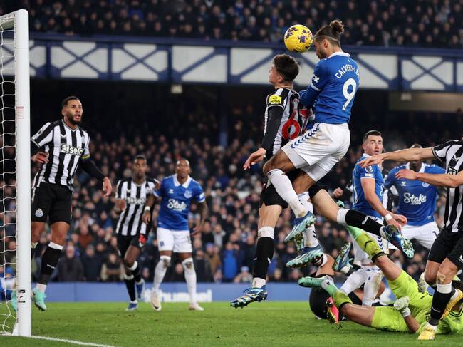 LIVERPOOL, ENGLAND - DECEMBER 07: Dominic Calvert-Lewin of Everton heads at goal during the Premier League match between Everton FC and Newcastle United at Goodison Park on December 07, 2023 in Liverpool, England. (Photo by Jan Kruger/Getty Images) / Jan Kruger