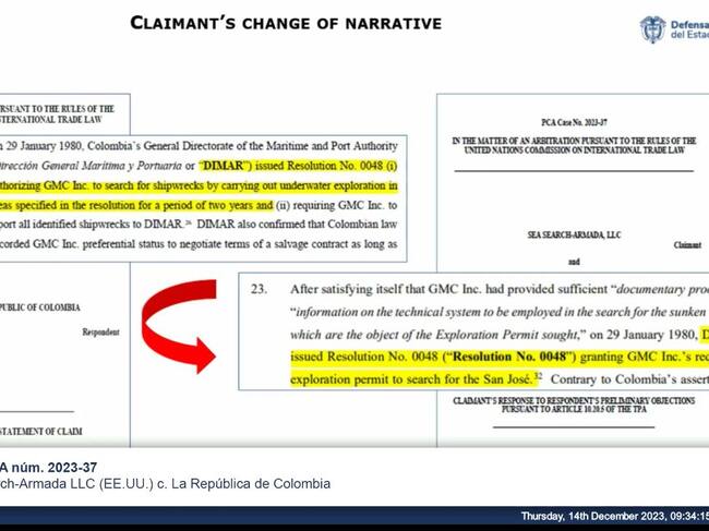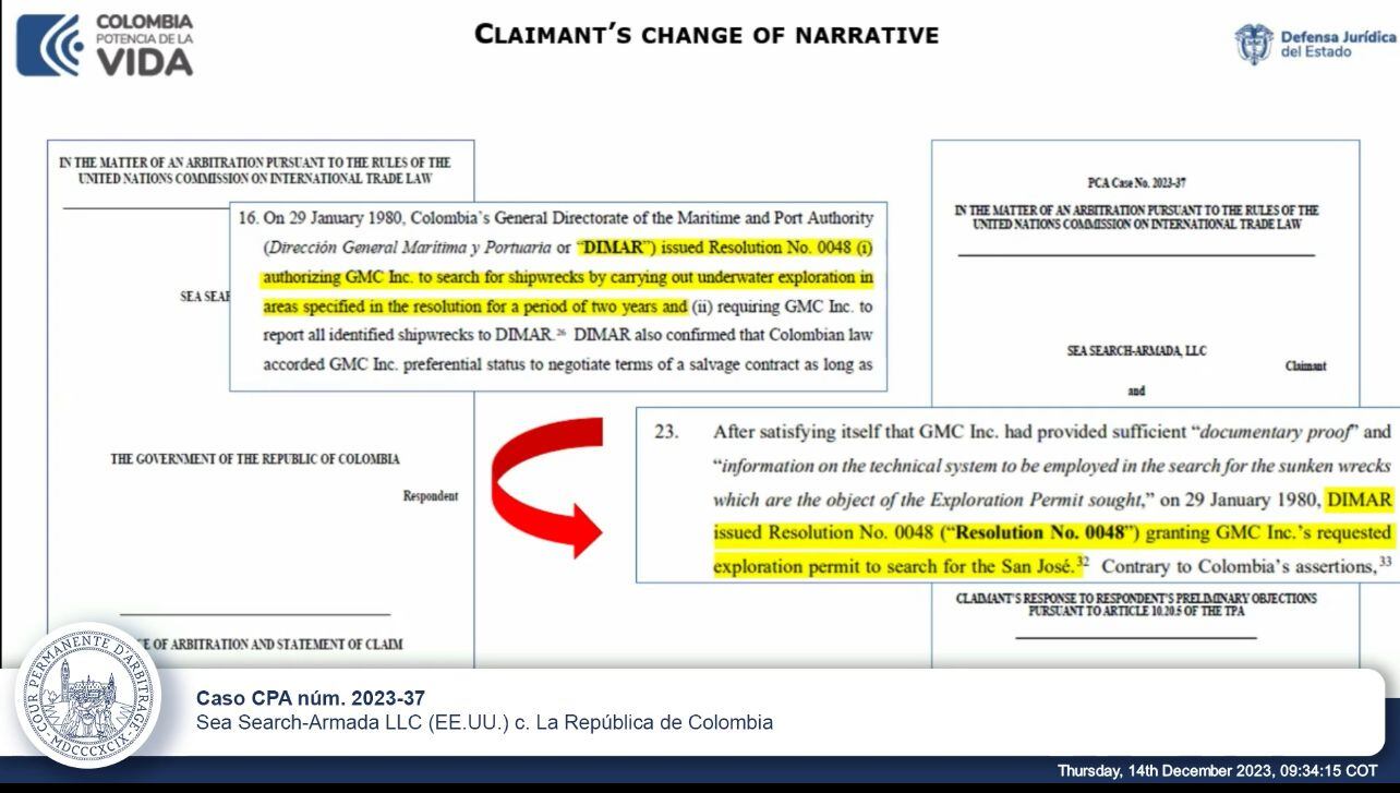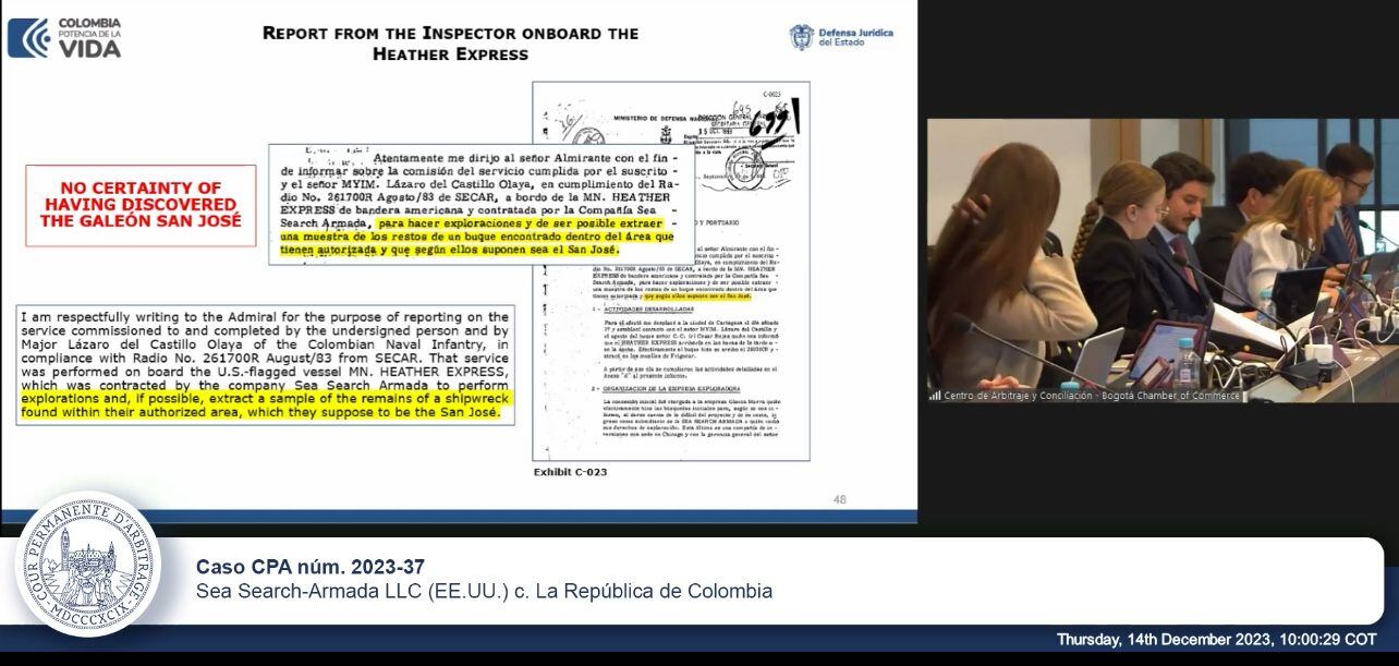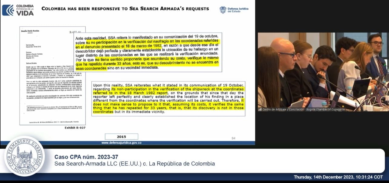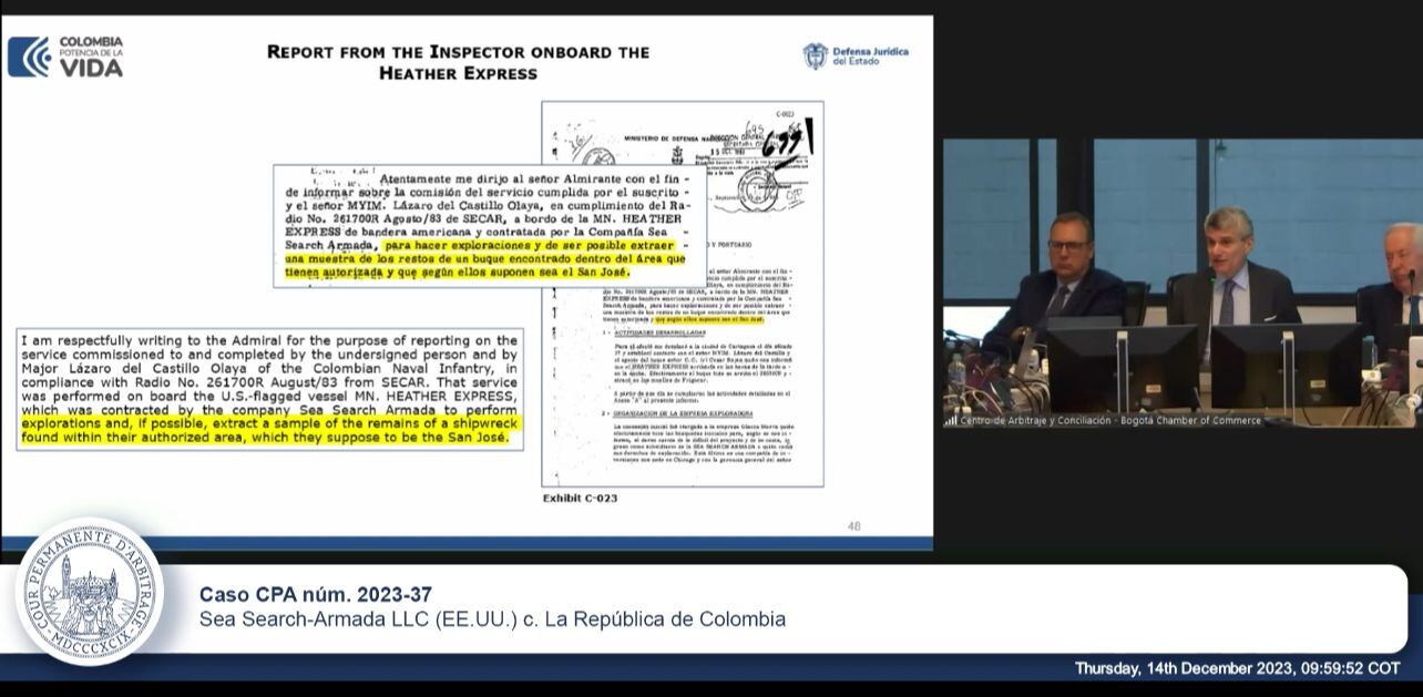 Este arbitraje fue iniciado en diciembre de 2022, en donde comenzó la controversia por los presuntos incumplimientos del Tribunal permanente de Arbitraje (TPA) alegados por Sea Search - Armada, lo que describe como sus derechos a un tesoro con un valor estimado en USD 10.000 millones de dólares, que fue presuntamente encontrado por los predecesores de la demandante en aguas de Colombia hace más de 40 años.