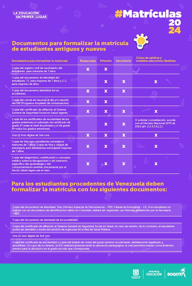 Documentos para formalizar la matrícula de estudiantes antiguos y nuevos. Foto: Secretaría de Educación del Distrito.