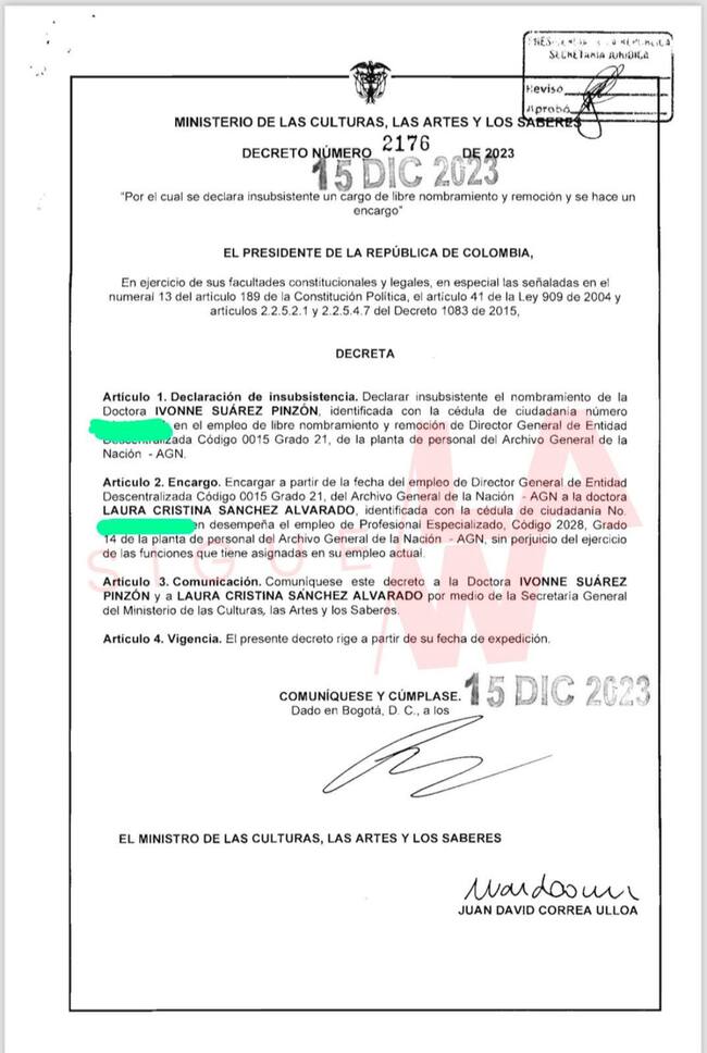 Mientras se resuelve toda esa polémica y se define si existe alguna causa para abrir investigaciones disciplinarias, se ha conocido también que a la dirección del Archivo General de la Nación, llegará Laura Cristina Sánchez Alvarado quien trabaja como profesional especializada también en esa entidad.