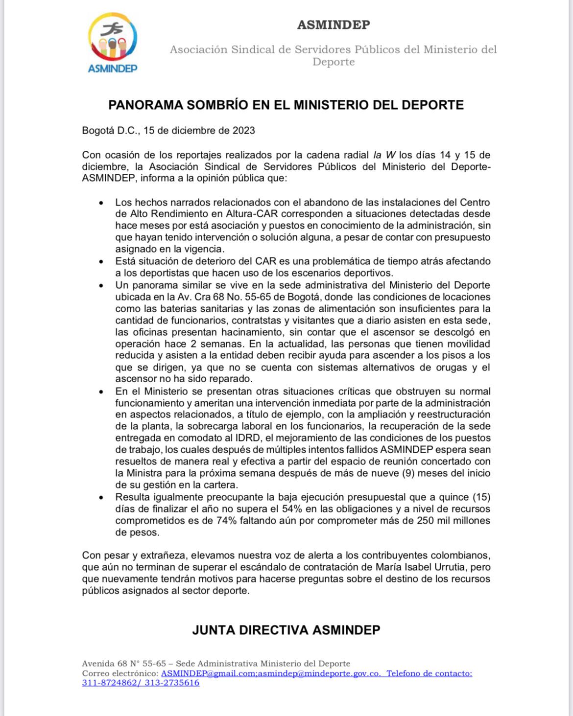 En respuesta a las recientes investigaciones realizadas por La W sobre el deterioro del Centro de Alto Rendimiento (CAR), la Asociación Sindical de Servidores Públicos del Ministerio del Deporte (ASMINDEP) ha hecho públicas graves preocupaciones sobre el estado de abandono de las instalaciones deportivas clave y las condiciones de trabajo en la entidad.
