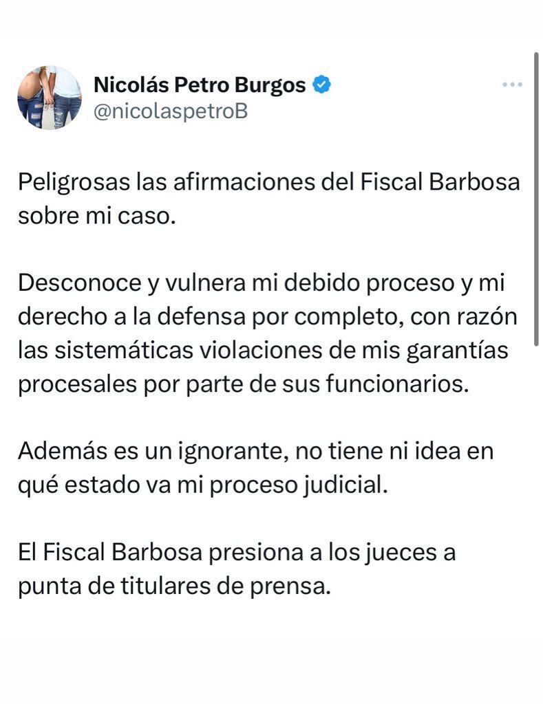 Nicolás Petro agregó que sus afirmaciones son “peligrosas” y que “presiona a los jueces a través de los titulares de las noticias de los medios de comunicación”.