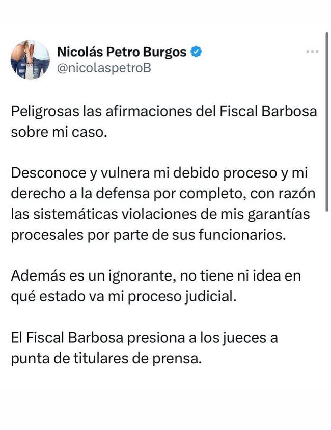 Nicolás Petro Burgos, hijo mayor del presidente de la República, Gustavo Petro, atacó fuertemente al fiscal general de la Nación, Francisco Barbosa, a través de sus redes sociales.