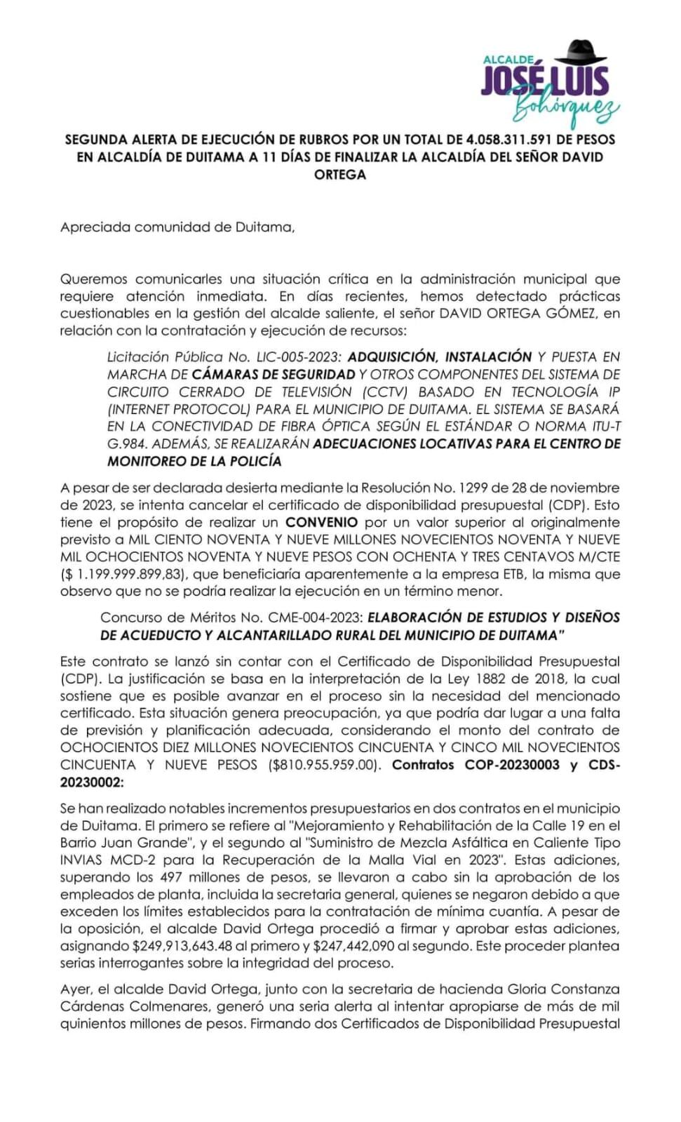 En las últimas semanas el alcalde electo de Duitama José Luis Bohórquez ha hecho pública a través de sus redes sociales unas alertas en las que aparentemente el mandatario actual David Ortega estaría ejecutando recursos por más de $4.000 millones, a pocos días para finalizar su gobierno.