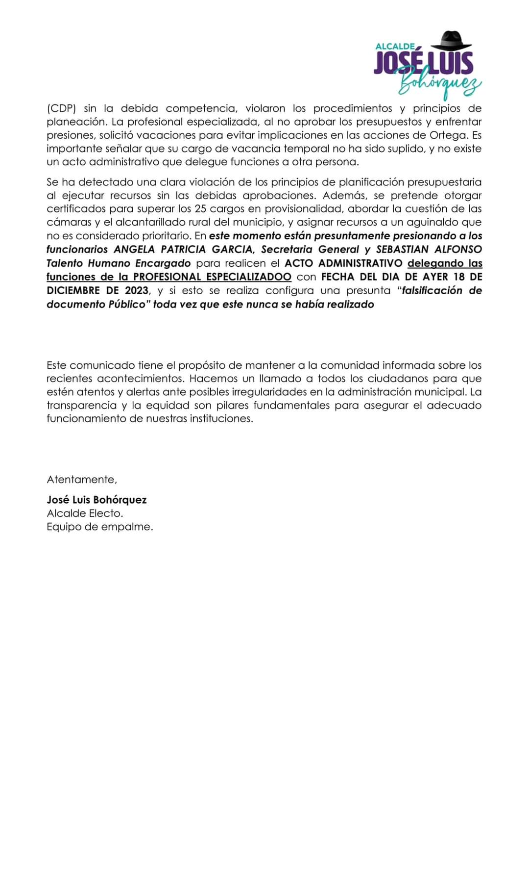 Este es el comunicado del electo alcalde de Duitama, Boyacá, José Luis Bohórquez sobre las presuntas irregularidades del actual mandatario David Ortega / Foto: Suministrada.