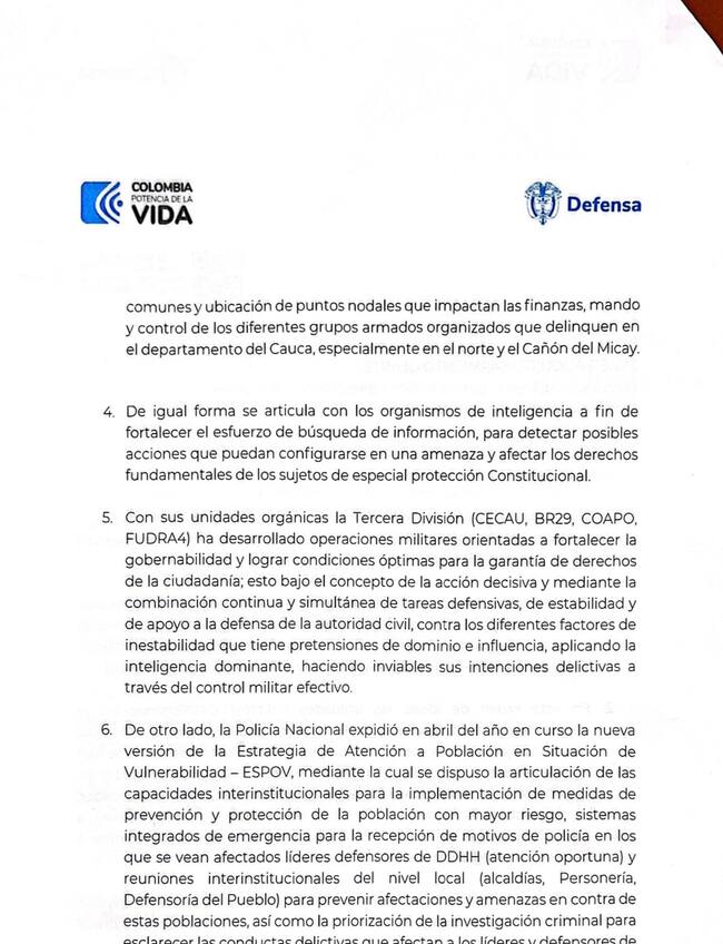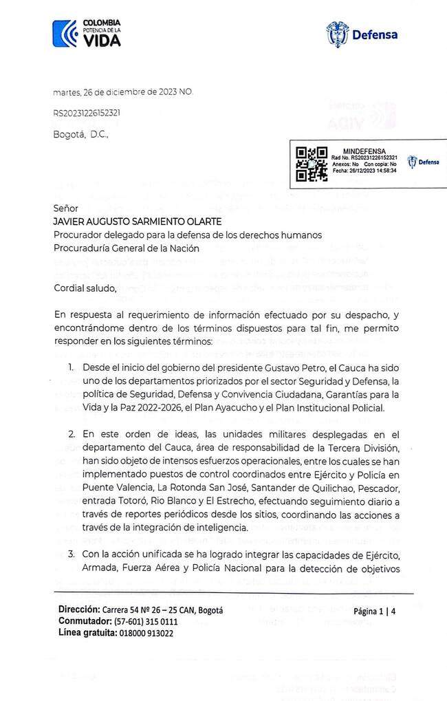 Finalmente, la Margarita Cabello anunció que ha hecho 22 requerimientos al Ministerio de Defensa por la falta de seguridad en el país, el último por la crisis en el Cauca, el cual fue firmado por la viceministra de veteranos: “esperemos haya sido con mucho respeto, pero no importa la respuesta quien la firme lo que importa es el contenido”, dijo Margarita Cabello.